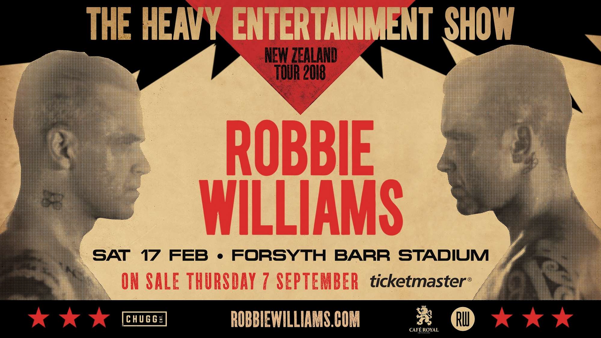 Global pop phenomenon, ROBBIE WILLIAMS, has confirmed that he will bring his mammoth Heavy Entertainment Show World Tour to New Zealand in February.