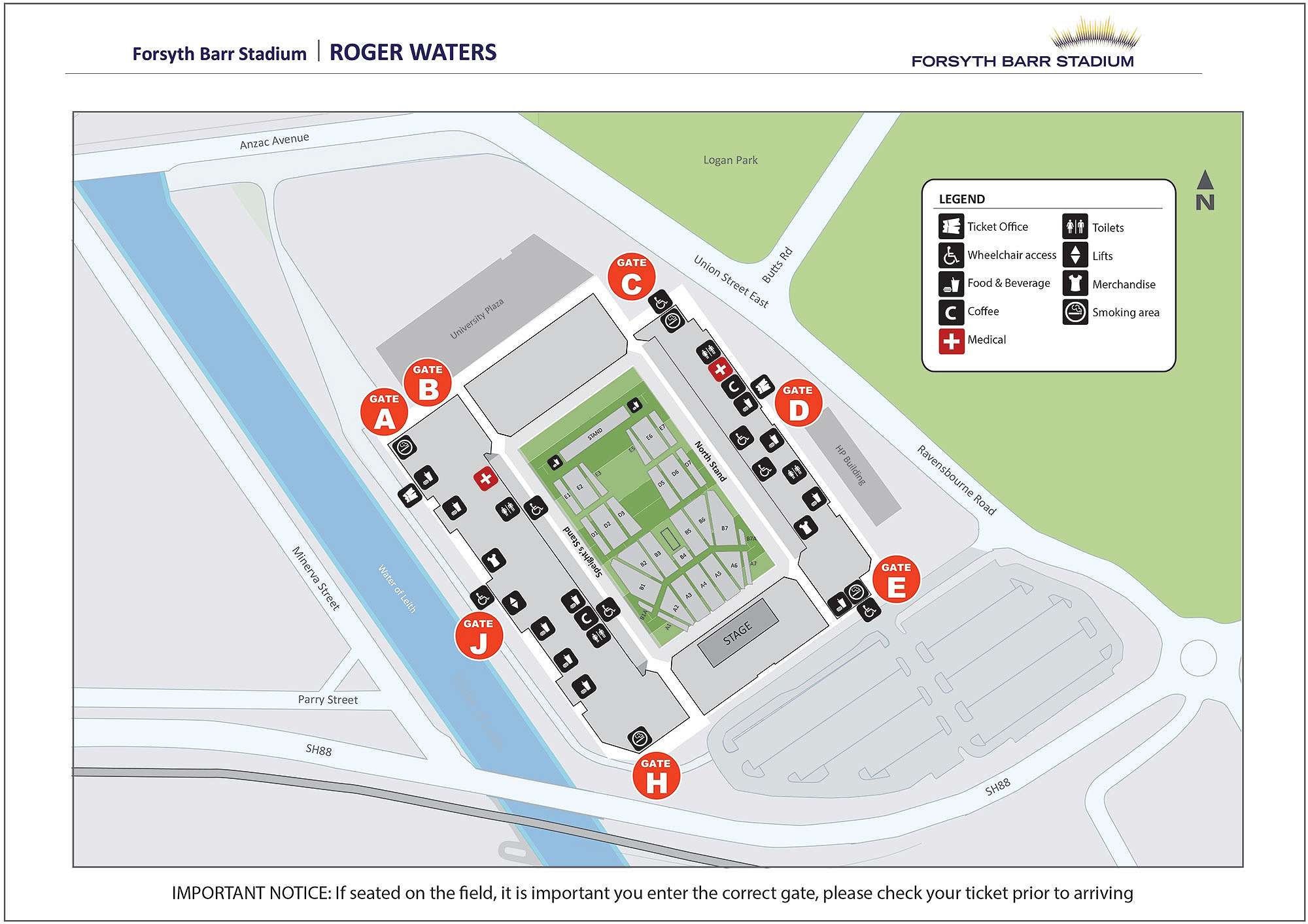 Gates will open at 6.30pm and Roger Waters will be on stage to open the show at 8pm. Please check your ticket for the correct entry Gate. Everyone will have a quick search on arrival which may cause delays so plan ahead and get here a little earlier than what you had planned to.