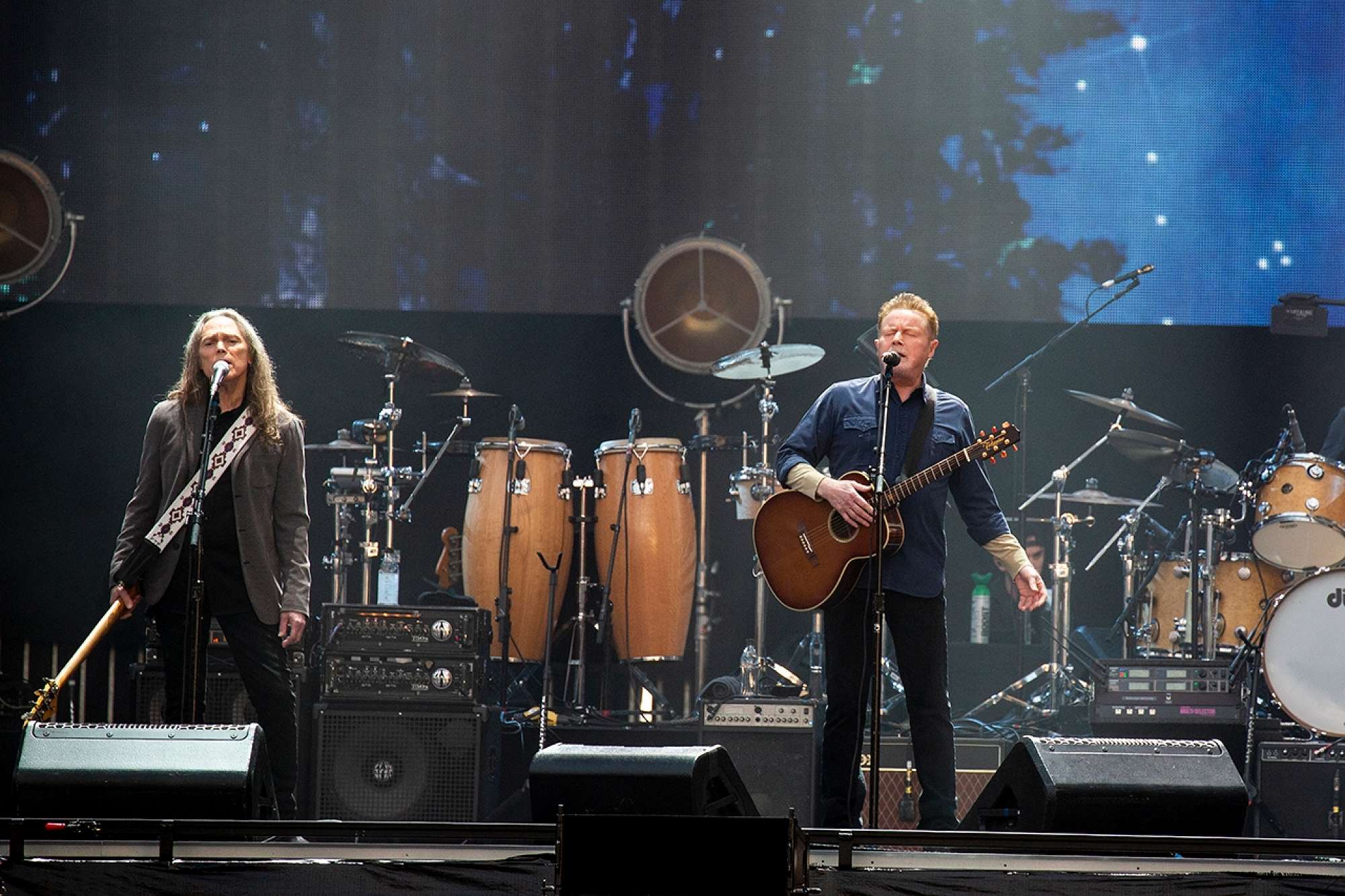 Deacon Frey, the son of the late Eagles legend, Glenn Frey added a new dimension to the band by being the youngest member by approximately four decades. Frey sang Peaceful Easy Feeling as sparkling stars floated around on the two huge screens that framed the stage. What a wonderful way to continue on his father's legacy. The crowd were up on their feet for Heartache Tonight and the one we'd all been waiting for - Hotel California.