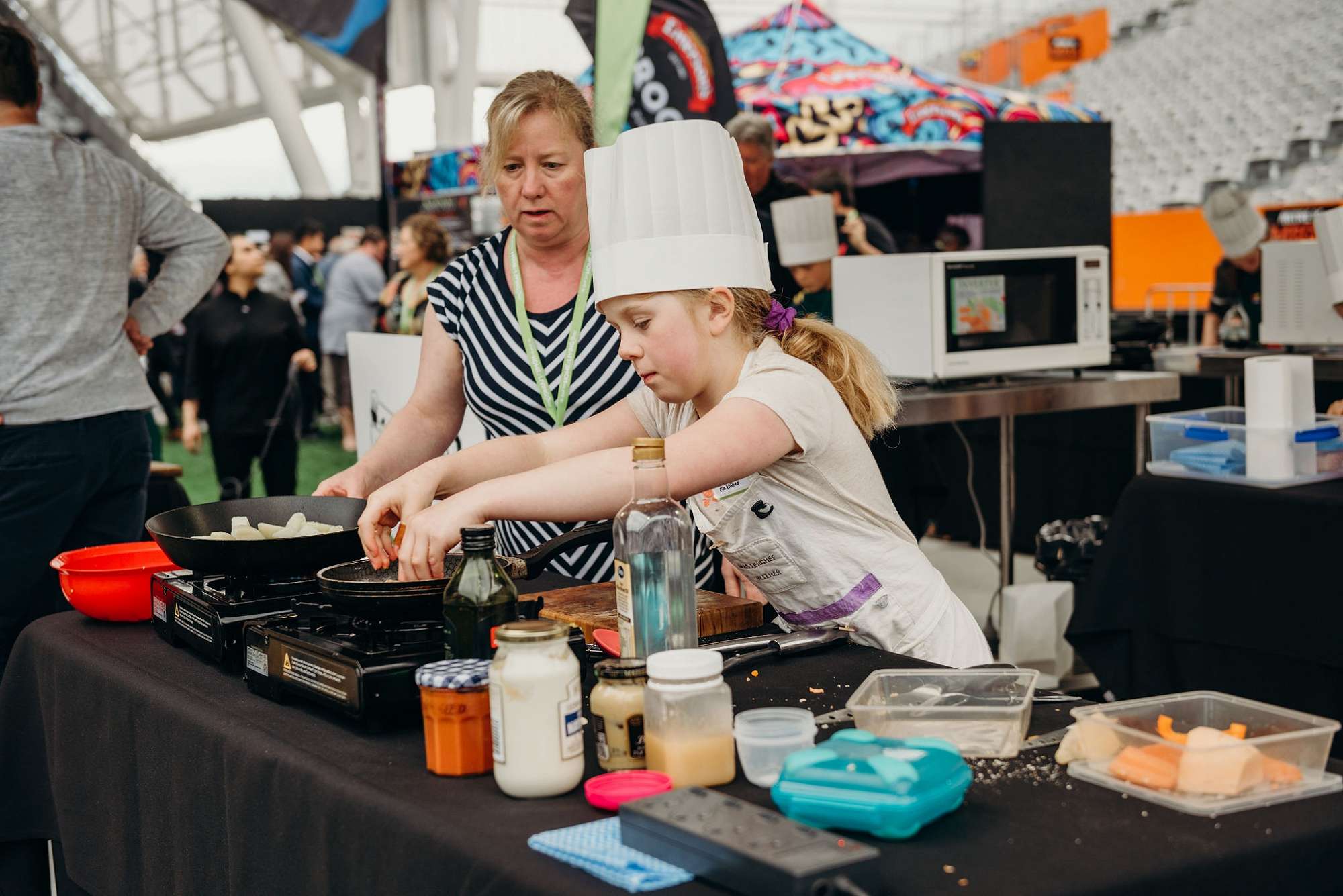 8 & Under: Mia North from Columba College cooking pasta with parmesan chips.