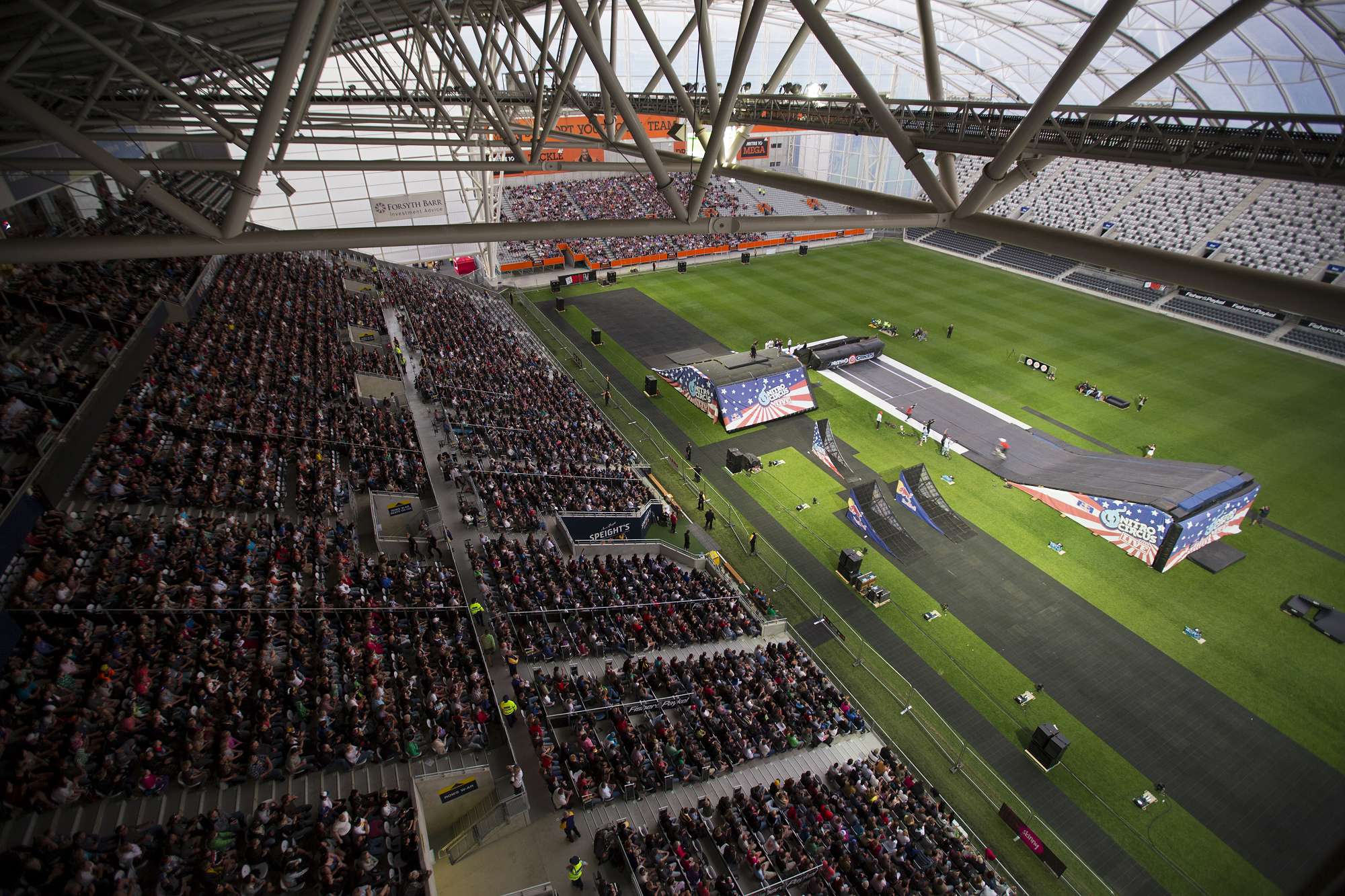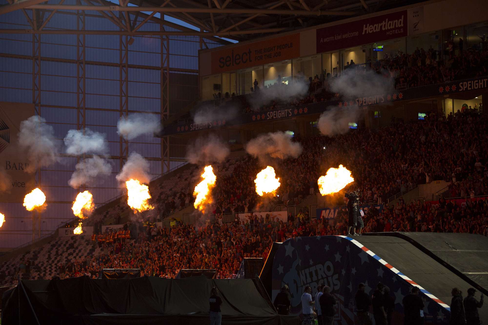 Enter the Elephant! Gus an 8-year-old resident of Karitane, Dunedin, came to the Circus on Friday the 6th February! Pastrama, the USA Nitro Circus mastermind and genius, enters the Dunedin Forsyth Barr Stadium on the back of a plastic elephant mimicking an era of Victorian heyday circus freak shows. A few seats away from Gus a clown runs through the audience, only to remove his mask and reveal himself as one of the motorbike riders in Pastrama’s show. Gus never took his eyes off the line up of bathtub riding, go-cart gliding, shopping trolley flying nutters down the length of a ‘gang plank’ death wish 35m semi ‘half pipe’ with a 40m gap leading into another half pipe.