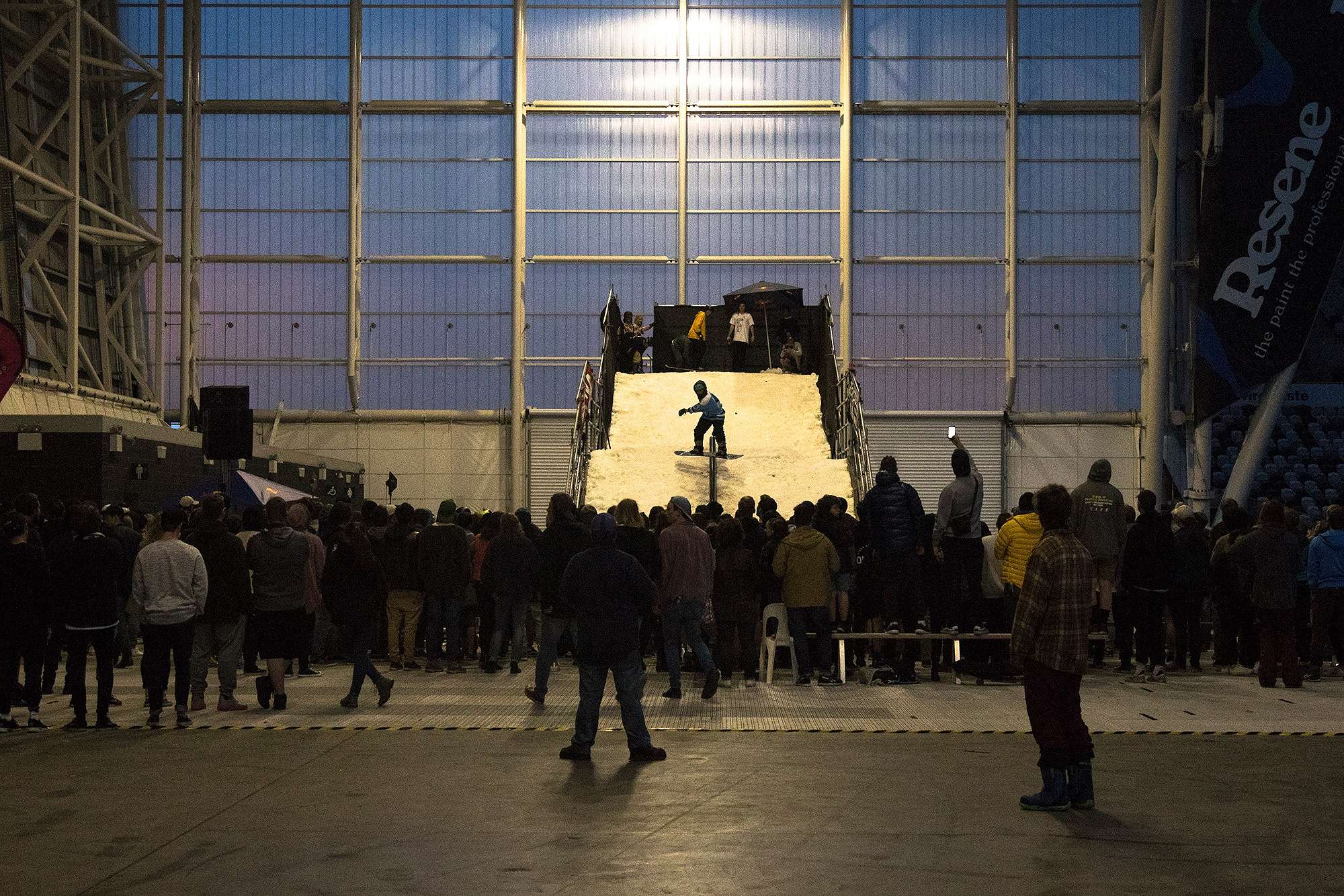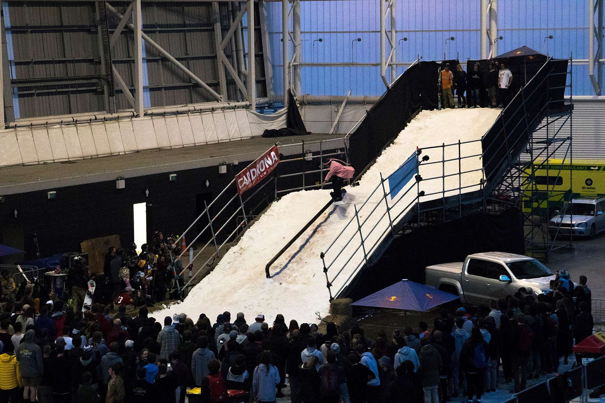 A specifically designed, 5m high scaffolding ramp complete with 2 x 5m Rail features was stacked with snow trucked in from Cardrona. The skills of 35 snowboarders and skiers were on display for the crowd.